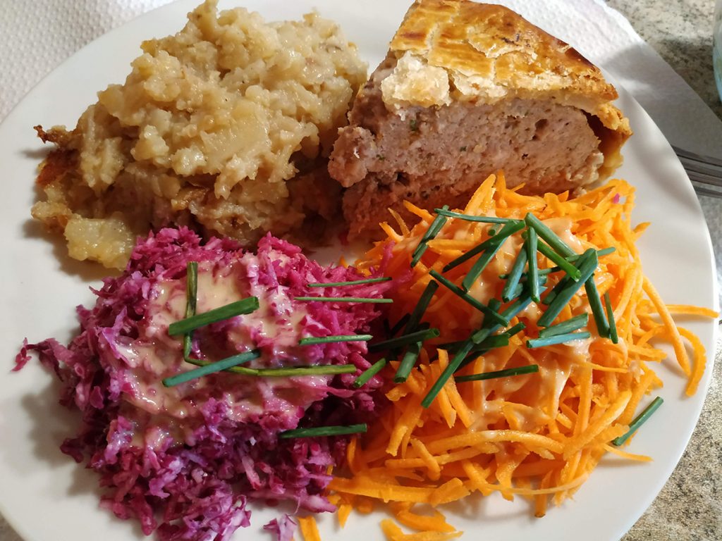 一つ目はお肉のパイ包み、トゥルト(tourte)です。牛肉や仔牛肉、豚肉の合い挽き肉に香味野菜とスパイスが入っていますが、レシピは各フェルム・オーベルジュで違います。キャロットラペなどのたっぷりの生野菜サラダとともにサービスされます。アルザスでは地元のレストランやパティスリーでもスペシャリテとして並ぶポピュラーなお料理ですが、すばらしい大自然の風景を愛でながら食べるトゥルトのおいしさといったら!